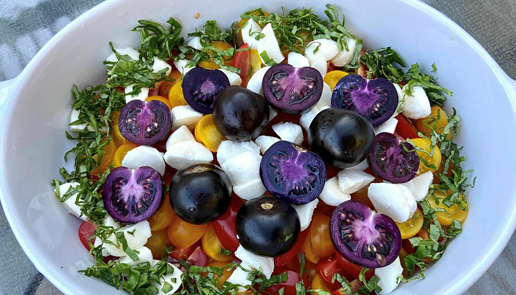 A caprese salad prepared with Purple Tomato. Norfolk Plant Sciences