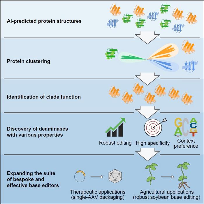 “We described the use of AlphaFold2 to predict and subsequently cluster an entire protein family based on predicted structure similarities. We selected deaminase proteins to analyze and identified many previously unknown properties,” the authors wrote. “We were surprised to find that most proteins in the DddA-like clade were not double-stranded DNA deaminases. We engineered the smallest single-strand-specific cytidine deaminase, enabling efficient cytosine base editor (CBE) to be packaged into a single adeno-associated virus (AAV). Importantly, we profiled a deaminase from this clade that edits robustly in soybean plants, which previously was inaccessible to CBEs.”