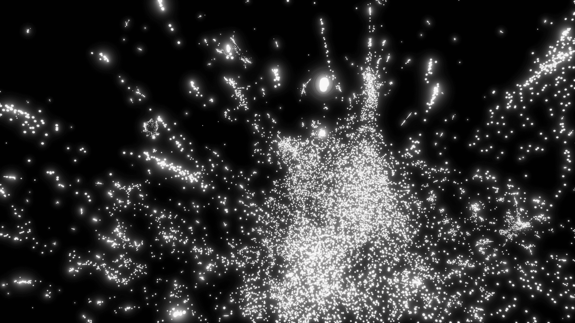 The world of natural proteins, represented in a 3D model based on protein functional attributes. The bright red cluster is a group of proteins predicted to be sweet, discoverable only by Shiru’s Flourish technology.