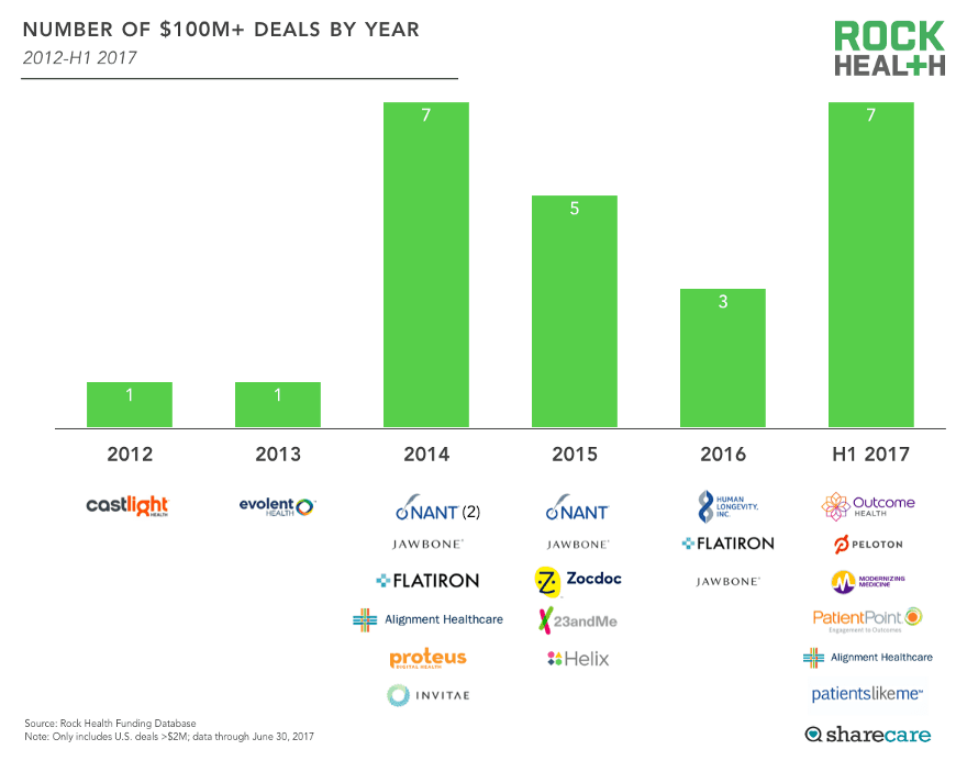 An increasing number of $100m+ deals as the sector matures but few exits to date. Image from RockHealth