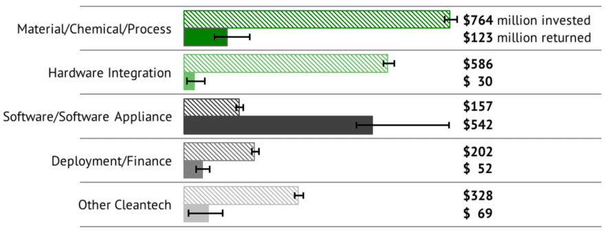 Cleantech has had a rough ride, $25bn went in and over half was lost. Investment peaked in 2008 but by 2012 it was dying with less and less VC money and less LPs willing to commit to dedicated fund. As an asset class it returned just 1.6% IRR (vs. 19% across the rest of the class over the same period) on early stage deals.