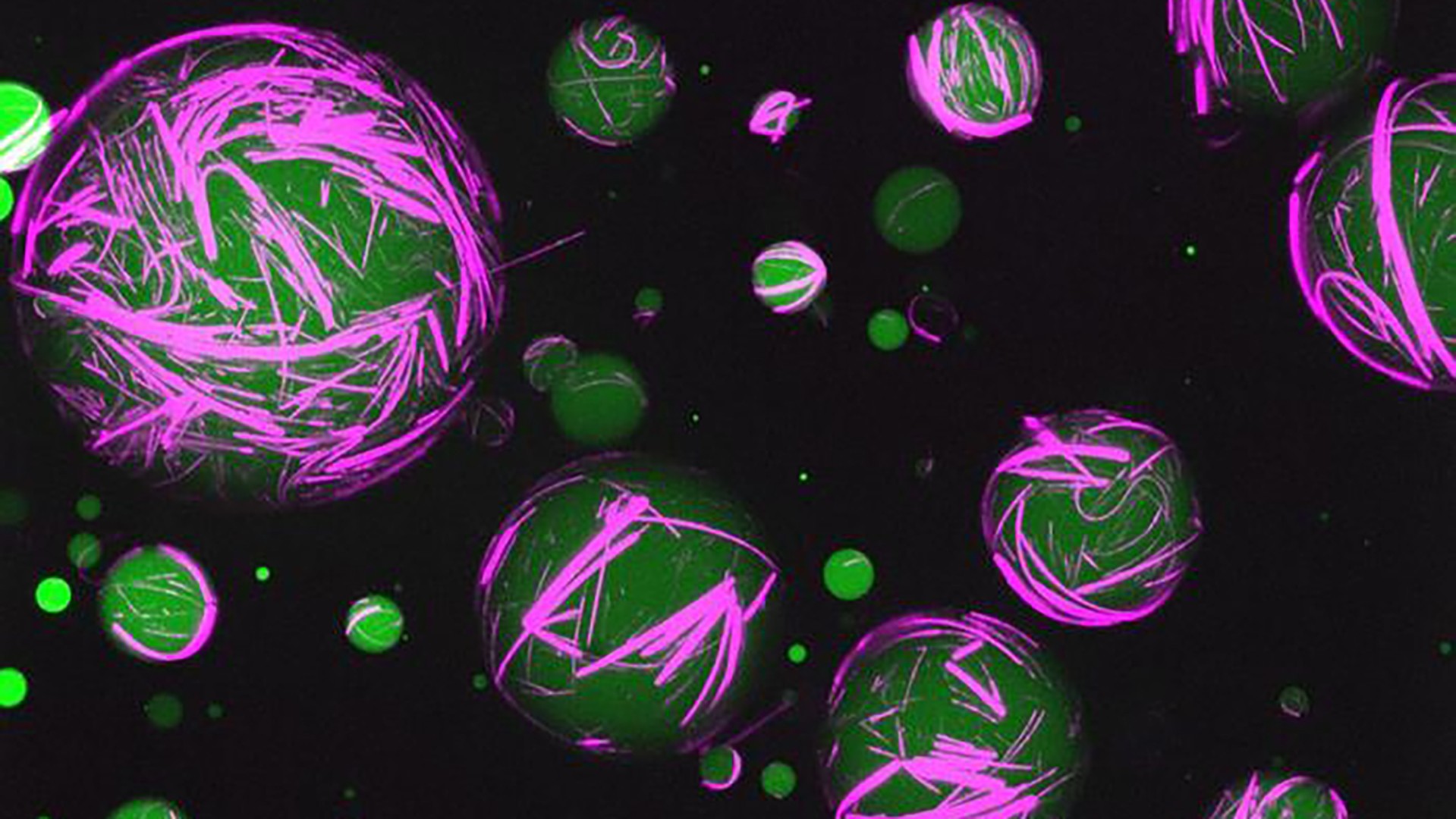 Synthetic cells created with programmable peptide-DNA technology that directs peptides, the building blocks of proteins, and repurposed genetic material to work together to form a cytoskeleton, shown in fuscia. [UNC-Chapel Hill]