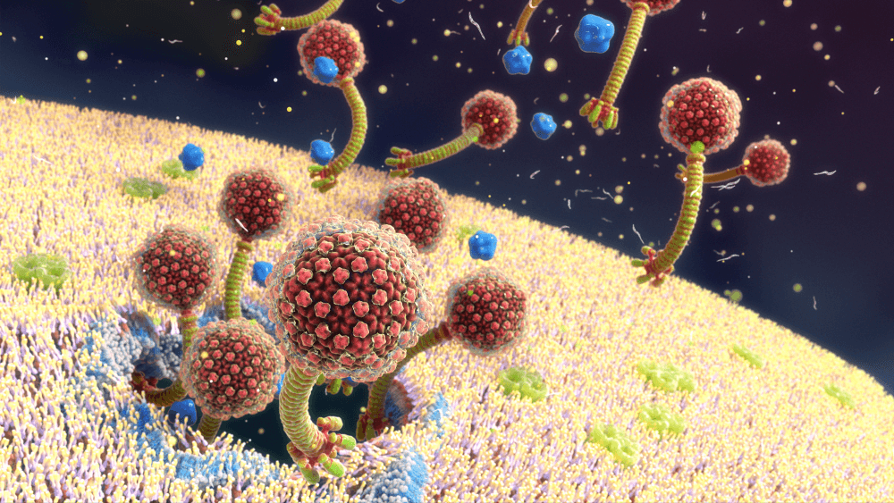 Siphoviruses exiting an infected bacterium, illustration. (Science Photo Library/Canva)