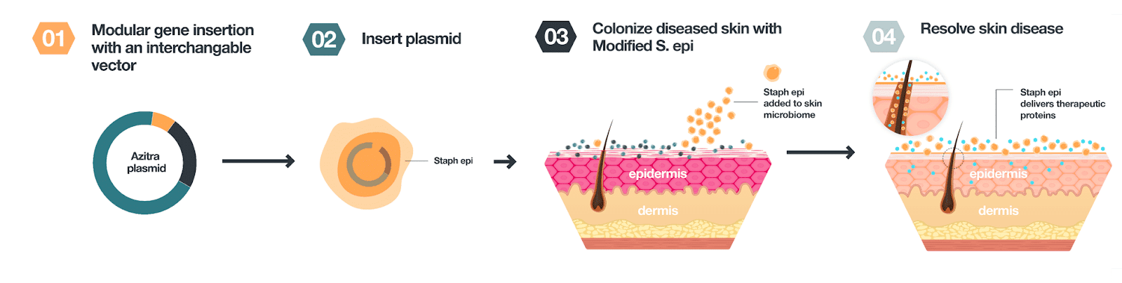 The potential benefits are clear: an improved understanding of S. aureus genetics, permissible now by successful plasmid-based genetic manipulation, could help us better fight, or even prevent, severe skin infections caused by this opportunistic pathogen. But others are focused on leveraging and building upon the beneficial characteristic of S. epidermidis.S. epidermidis is a commensal skin bacterial species that is one of the first colonizers of human skin. It plays an important role in cutaneous immunity and maintaining a healthy skin microbiome. Several research groups have attempted to leverage S. epidermidis’ inherent beneficial properties to improve skin health. In Japan, topical application of S. epidermidis increased lipid content of the skin, suppressed water evaporation, and improved skin moisture retention. Others have shown that S. epidermidis produces antimicrobial peptides (AMPs) that selectively target S. aureus, which is increased on the skin of those with eczema. Adding S. epidermidis and a related species, S. hominis, to the skin of people with atopic dermatitis caused levels of S. aureus on the skin to decrease significantly.But what if you could genetically manipulate the organism to optimize its benefits to human skin? That is exactly the question that biotech company Azitra is trying to answer.Azitra is focused on using bioengineered S. epidermidis to not only target skin conditions such as eczema but also to strengthen and maintain healthy skin. They are using a sophisticated plasmid, introduced into S. epidermidis, to deliver the human protein filaggrin to the skin. Filaggrin maintains a strong skin barrier, and is often damaged in people suffering from eczema. Essentially, the Azitra team have taken an already beneficial microbe and upped the ante on its protective effects by giving it the means to produce a human protein essential for healthy skin.