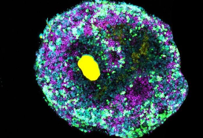 Retinal organoid with a microscopically small bead of DNA (yellow) and various retinal cell types (green, cyan, magenta). [Cassian Afting, AG Wittbrodt]