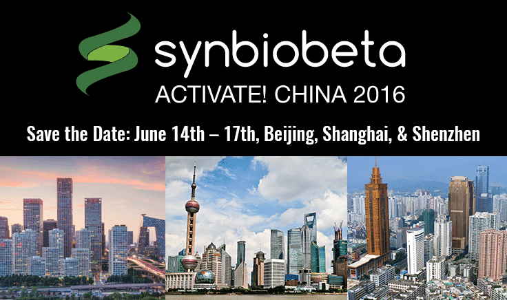 This year, SynBioBeta is excited to announce the first SynBioBeta Activate! China conference on June 14th - 17th. This conference is in addition to our 4th annual conference in London this year and SynBioBeta’s 5th annual conference in San Francisco.This is an especially appropriate time for SynBioBeta to hold a conference in China since the country has made such huge investments in synthetic biology and the life sciences over the past few years. In addition, China continues to fill the pipeline of U.S. universities with post-docs - some of which choose to head back to China after graduation and set up their own labs and companies.I’m excited to see where the growth of synthetic biology can go in China. They have the world’s second largest economy and are a powerhouse in many industries now, particularly manufacturing. As China continues to change from a rural economy to a city-dwelling and technological, knowledge economy, it’s clear that biotechnology is going to play an important part in that.This conference will be home to three exclusive events from June 14-17, 2016 in Beijing, Shanghai and Shenzhen.In addition to these exclusive sessions, SynBioBeta will be conducting a tour associated with the visits. We’ll be covering a growing number of people and stories in China on the blog here and in the digests, so keep posted for more information coming soon!If you are interested in learning more about SynBioBeta Activate! China 2016 or receiving notifications about the event, you can sign up for alerts on the event webpage.