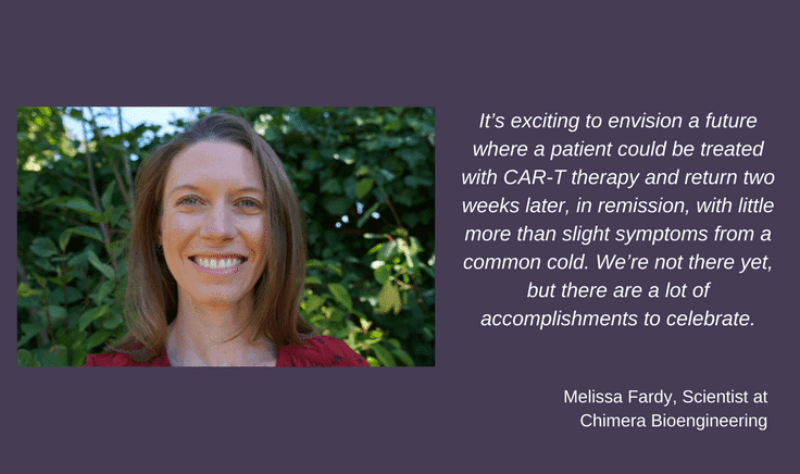 For years, the foundations of cancer treatment were chemotherapy, surgery, and radiation therapy. But over the past several years, progress with therapies that collect and use a patient’s own immune cells to attack tumors (in other words, immunotherapy) have greatly accelerated. Leading the charge among immunotherapies is CAR-T cell therapy, the first variety of which was approved last month by the US FDA.As its name implies, the backbone of CAR-T cell therapy is T cells, which play a critical role in killing cells infected by pathogens. The therapy works by collecting blood from patients and isolating their T cells from these samples. These cells are engineered in the lab to produce receptors on their surface called chimeric antigen receptors, or CARs. The receptors allow T cells to recognize and attach to a specific protein, or antigen, on tumor cells. The cells are then grown in the lab and multiplied into the hundreds of millions. Finally, the CAR-T cells are infused back into the patient. If all goes as planned, the engineered cells further multiply in the patient’s body, recognizing and killing cancer cells that harbor the antigen on their surfaces.One of the companies working on this technology is Chimera Bioengineering, co-founded by renowned synthetic biologist Professor Christina Smolke of Stanford University. Chimera is a resident at JnJ’s prestigious JLABS incubator in South San Francisco and has the support of StartX, the Stanford affiliated accelerator, as well as Illumina Accelerator. Chimera leverages a combination of synthetic biology and immunotherapy to bring more effective and safer CAR-T therapeutics to cancer patients.To learn more, we interviewed Melissa Fardy, a scientist at Chimera, who will be speaking in the Cell Factories for Biopharmaceuticals and Healthcare session (Sponsored by Synthetic Genomics) at SynBioBeta SF 2017 on October 3rd.Why are CAR-T cell therapies such an exciting field to be part of at the moment?We each have nature's most advanced anti-cancer system, our own immune system, constantly doing work, clearing malignant, infectious, or disease-causing cells, all the while we are none the wiser. CAR-T therapy is tweaking what nature has created, empowering patients to fight and eradicate cancer leveraging their own immune systems.It’s exciting to envision a future where a patient could be treated with CAR-T therapy and return two weeks later, in remission, with little more than slight symptoms from a common cold. We’re not there yet, but there are a lot of accomplishments to celebrate. CAR-Ts have been hugely successful in providing curative treatment to patients with refractory leukemia and with Novartis’s seminal FDA approval of their Kymriah treatment just last month, the door has swung wide open for a plethora of other immunotherapies, including CAR-T treatment for solid tumors. Can you tell us about your projects at Chimera Bioengineering?Despite tremendous progress in certain indications, immunotherapy remains, like chemotherapy or radiation, a blunt instrument against cancer. It often comes with side effects that are not only potentially fatal, but, importantly, scary, dehumanizing and demeaning. At Chimera we engineer CAR-T cell immunotherapies to not only enhance efficacy against difficult-to-treat tumors, but also reduce toxic side effects and restore dignity to patients. Our two primary projects, SUGR and GOLD, leverage synthetic RNA-based control systems for rapid, real-time tuning and more efficacious CAR-Ts. We believe that RNA-based control systems are ideal for cell therapies because they function without the immunogenic side effects that can greatly limit protein-based control systems.Our SUGR platform enables small-molecule control of CAR expression, making it possible to titrate the intensity of CAR-Ts based on traditional pharmacological dosing strategies. Our second RNA-based platform, GOLD, can supercharge CAR-Ts by conditionally delivering high levels of powerful therapeutic payloads, such as cytokines and checkpoint inhibitors, directly at the site of the tumor. What challenges persist in your field, and what progress has your team – or other peers – made in overcoming them?One of the greatest challenges for CAR-T therapy is control. Because CAR-Ts are living therapies it’s impossible to control the dosage once the cells are infused into the patient. Unlike traditional therapies where higher dosages lead to increased efficacy, the immune system requires a delicate balance. Unpredictable T-cell proliferation can create situations that are ‘too hot’ or ‘too cold' leading to runaway toxicity or ineffective tumor clearance. Chimera’s SUGR technology can directly address this problem by allowing physicians to tune the CAR expression so the T-cell activation and proliferation is ‘just right’ for each patient.CAR-Ts can also struggle to mount an effective response within the immunosuppressive microenvironment of solid tumors. Therapeutic payload delivery directly within the tumor microenvironment can help counteract these issues and even boost the CAR-T activity. Chimera’s GOLD platform uses the CAR-T cells as factories to produce compounds that remodel and deactivate the microenvironment. These compounds (cytokines, checkpoint inhibitors and the like) can be systemically toxic, so our GOLD payload delivery system limits their production to activated CAR-Ts that are proximal to the tumor.In addition to Chimera, there are several other amazing companies making progress on a variety of control systems and mechanisms for payload delivery and we’re excited to see how we can all help to improve patient outcomes. What are the upcoming milestones and long-term priorities for your company?We are currently working to achieve robust in vivo proof-of-concept of our GOLD platform, develop new SUGR switches through rational design and library screening, and advance our preclinical pipeline. Our long-term goal 