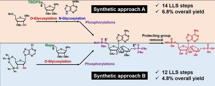 "The problem is lack of the availability of homogeneous oligo- and poly(ADP-ribose) samples, which are necessary for molecular-level studies to elucidate their detailed functions,” explained co-corresponding author Hide-Nori Tanaka, an assistant professor at iGCORE. He illuminated the issue with clarity, highlighting the challenge of studying these molecular enigmas. “To address this bottleneck and accelerate ADP-ribose biology, we developed two practical synthetic approaches to ribosyl adenosine 5',5"-diphosphate, a fragment of poly(ADP-ribose), for providing structurally well-defined ADP-ribose oligomer and polymer.”