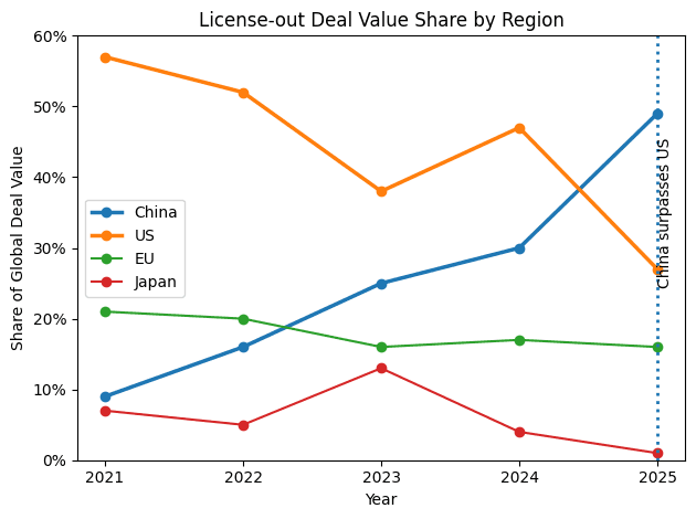 Capital Followed Execution: In 2025, China surpassed the U.S. in blockbuster deal origination (35 deals ≥$1B vs. 33–34 in the U.S.). China’s share of global license-out deal value reached ~50% in 2025, while the U.S. fell to ~27–28%. Today, one-third of new compounds in U.S. pharma pipelines originate from Chinese companies. Total Chinese out-licensing value reached a record $135.7B for the full year 2025—nearly triple the $51.9B from 2024.