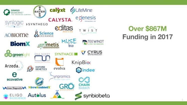 Two months ago we brought you the news that the synthetic biology industry was on track for another fantastic year of funding, with over $500 million in venture capital, public funding, and grants raised in the first seven months of 2017. We’re now thrilled to bring you the update that in the past two months alone, that figure has grown to an unbelievable $867 million. This puts the industry on track to match or even beat its record-breaking 2016 year of funding.Back in July, the uncontested leaders in the fundraising landscape were the MIT CRISPR spinout Editas Medicine with a $90 million stock offering, synthetic DNA maker Twist Bioscience with $60 million raised, and GM crop producer Calyxt with a $56 million IPO. In the past 60 days, however, that leader board has been given a thorough shake-up and a number of new mega-raisers have joined their ranks.Most notably, Editas has been dethroned from its position as the number one fundraiser by a new collaboration between Bayer and Ginkgo Bioworks. The yet-unnamed company raked in a $100 million series A round-- yes, you heard that right: series A-- from its parent companies and additional investors. This venture will merge Ginkgo Bioworks’ platform for engineering custom microorganisms and Bayer’s plant biologics innovation. Bayer and Ginkgo’s focus will be on developing a sustainable source of nitrogen fertilizer for crop plants by tinkering with the nitrogen-fixing microbes upon which these plants rely. This is the kind of platform whose profound transformative potential can really only be conveyed in something like a mind-boggling $100-million series A.
