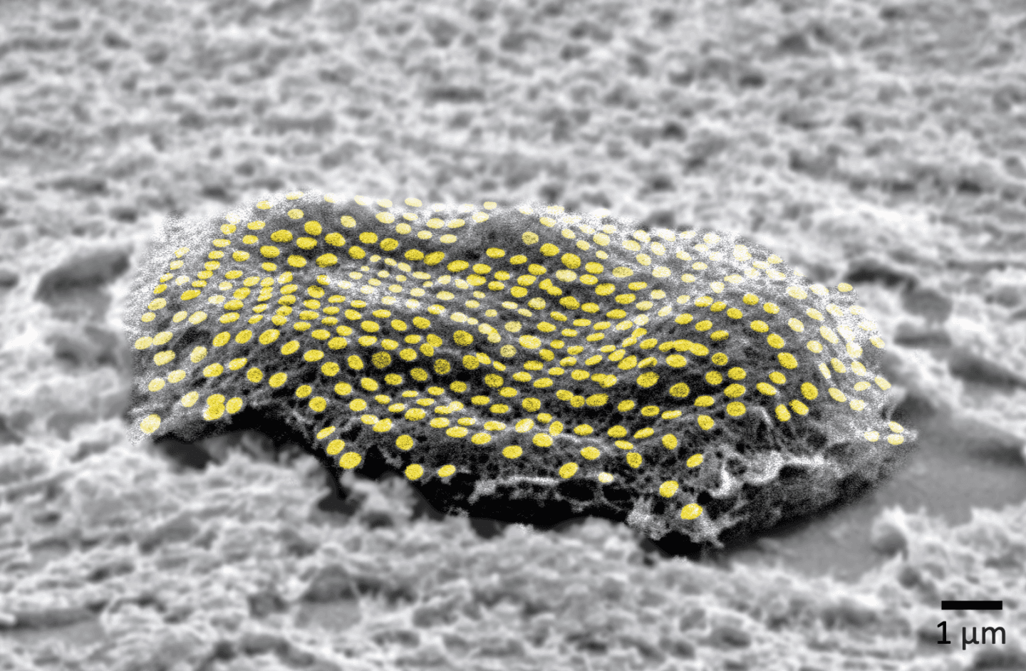 False-colored gold nanodot array on a fibroblast cell (Kam Sang Kwok and Soo Jin Choi, Gracias Lab/Johns Hopkins University)